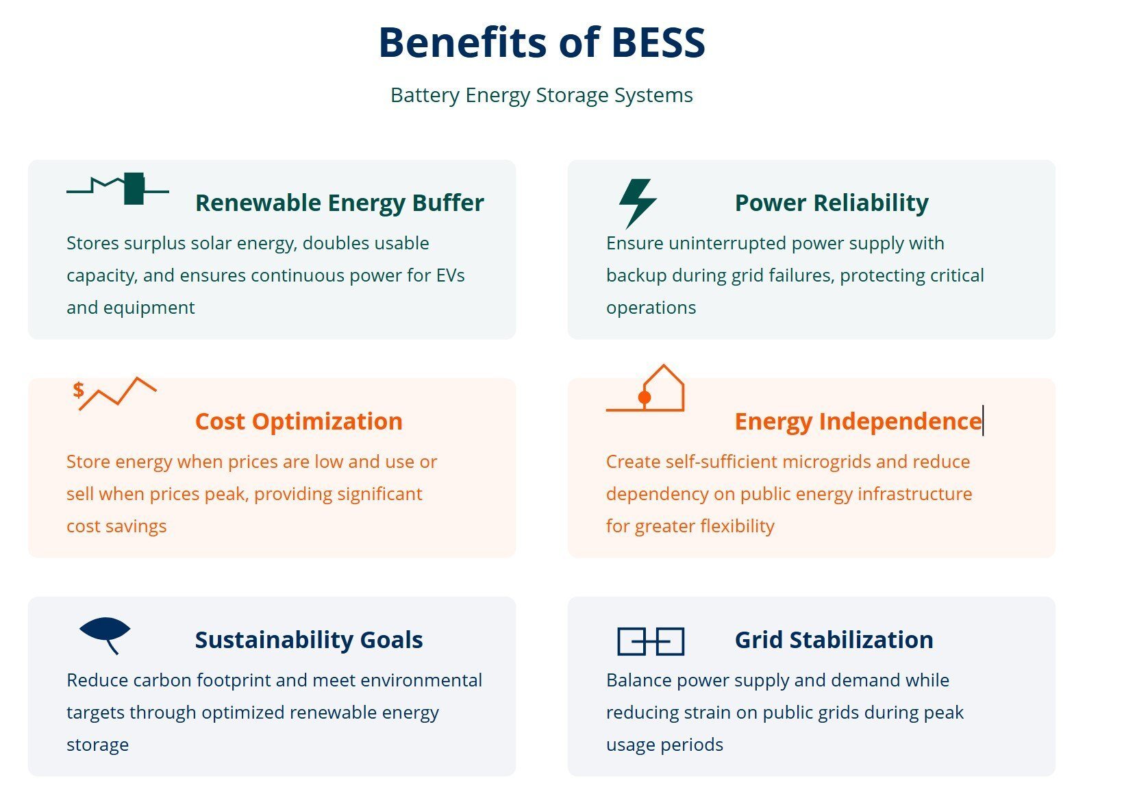 - Integration with Existing Systems: A BESS works best when combined with Energy Management Systems (EMS), Electric Vehicle (EV) charging stations, and grid-connected renewable sources. This approach creates a seamless infrastructure that optimizes power use across all operations.