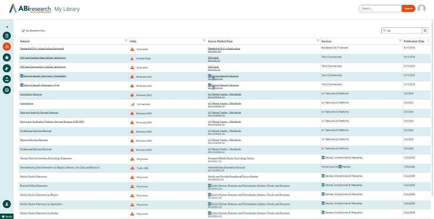 ABI Research is here to support your journey toward becoming a data-driven organization, providing the forecasts and tools necessary to succeed in a dog-eat-dog landscape. Learn more about how ABI Research can support your organization with quantitative analysis across technology markets by reviewing our most recent MDs, checking out our DataStream page, or watching the My Library demo to learn more about the updated client experience.