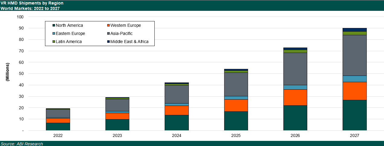 Despite lower HMD shipments in other parts of the world, every region is expected to grow at an explosive rate. For example, the Middle East & Africa region will grow at a CAGR of 44.7% from 2022 to 2027.