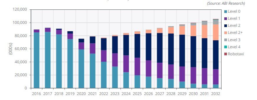A chart forecasting shipments of autonomous vehicles throughout the year 2032 based on the level of automation the vehicle features