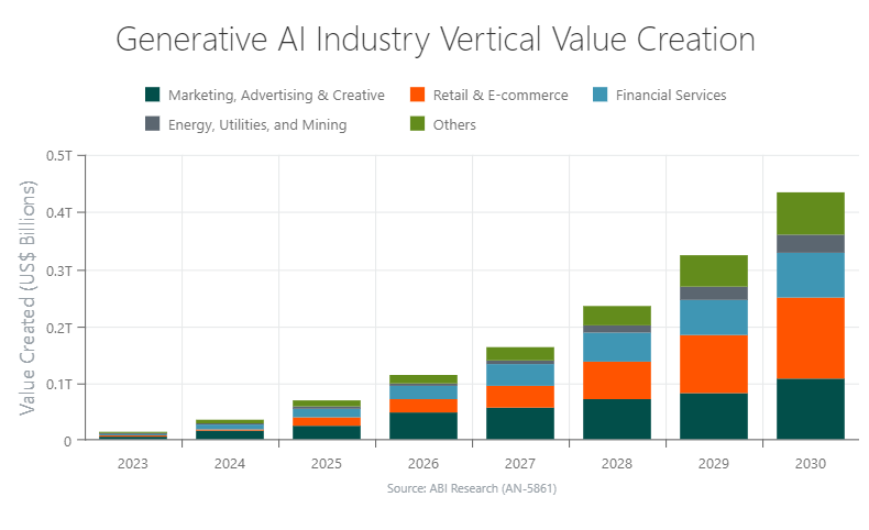 Enterprise interest in generative AI software is so significant that ABI Research expects it to add more than US$450 billion in value across 12 verticals by 2030. Generative AI will be used differently in each industry, with retail and e-commerce being the biggest beneficiaries of adopting the technology. The value of generative AI in business contexts stems from enormous productivity gains, accelerated time to market for new products/services, and improved customer service.