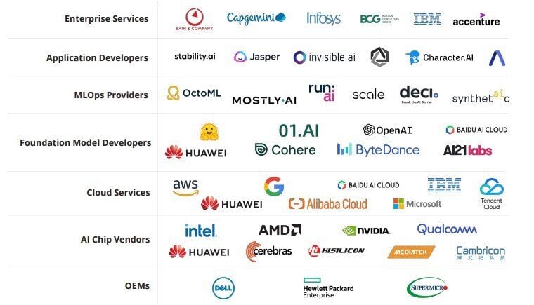 ABI Research identifies 7 company types that can exploit the growing demand for Gen AI solutions. Figure 1 includes these company types and the organizations in these categories.