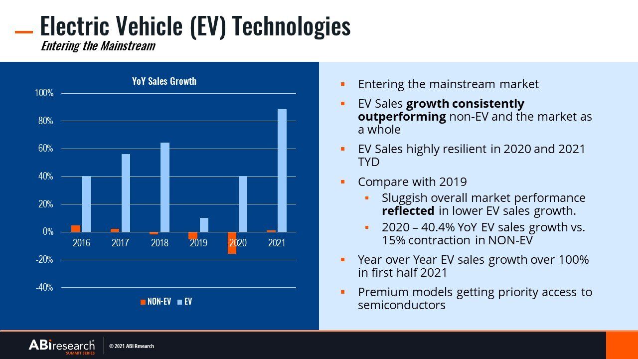 The global semiconductor shortage has prompted manufacturers to devote more of their efforts to higher-priced vehicles, including EVs. That shortage will persist at least through the first half of 2022, and EV sales growth should continue to outstrip conventional internal combustion auto sales.