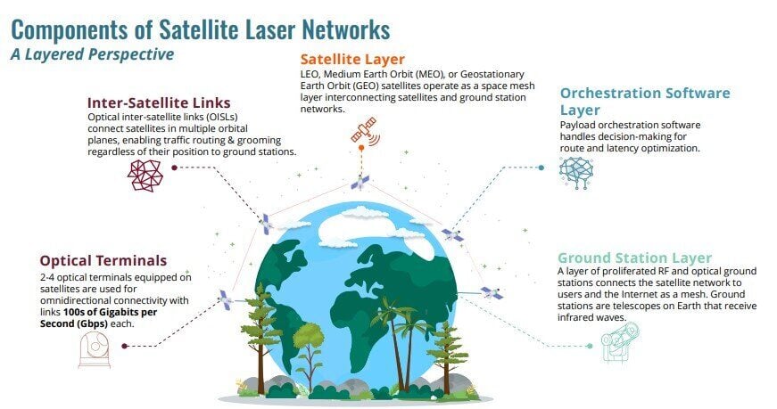 A laser satellite network consists of five key components: optical terminals, inter-satellite links, the satellite layer, the orchestration software layer, and the ground station.