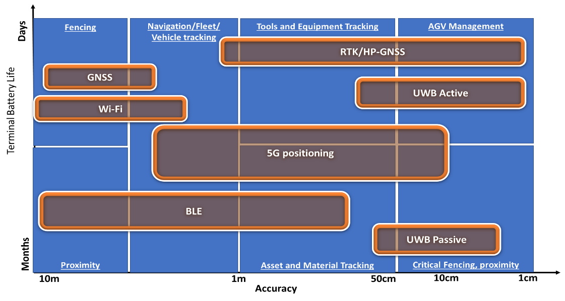 Each RTLS use case has its own requirements. Applications that include Automated Guided Vehicles (AGVs) and mobile robots, worker safety applications, tool tracking, forklift location, access control, and high-value production monitoring and compliance can all benefit from Centimeter (cm)-level precision technologies, such as UWB, whereas other less precise technologies can be leveraged for broader logistics and asset tracking applications, lower-value assets, and more scalable implementations that require less stringent accuracy.
