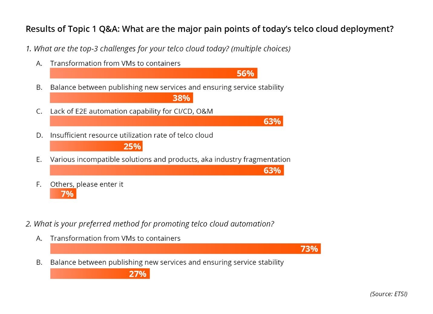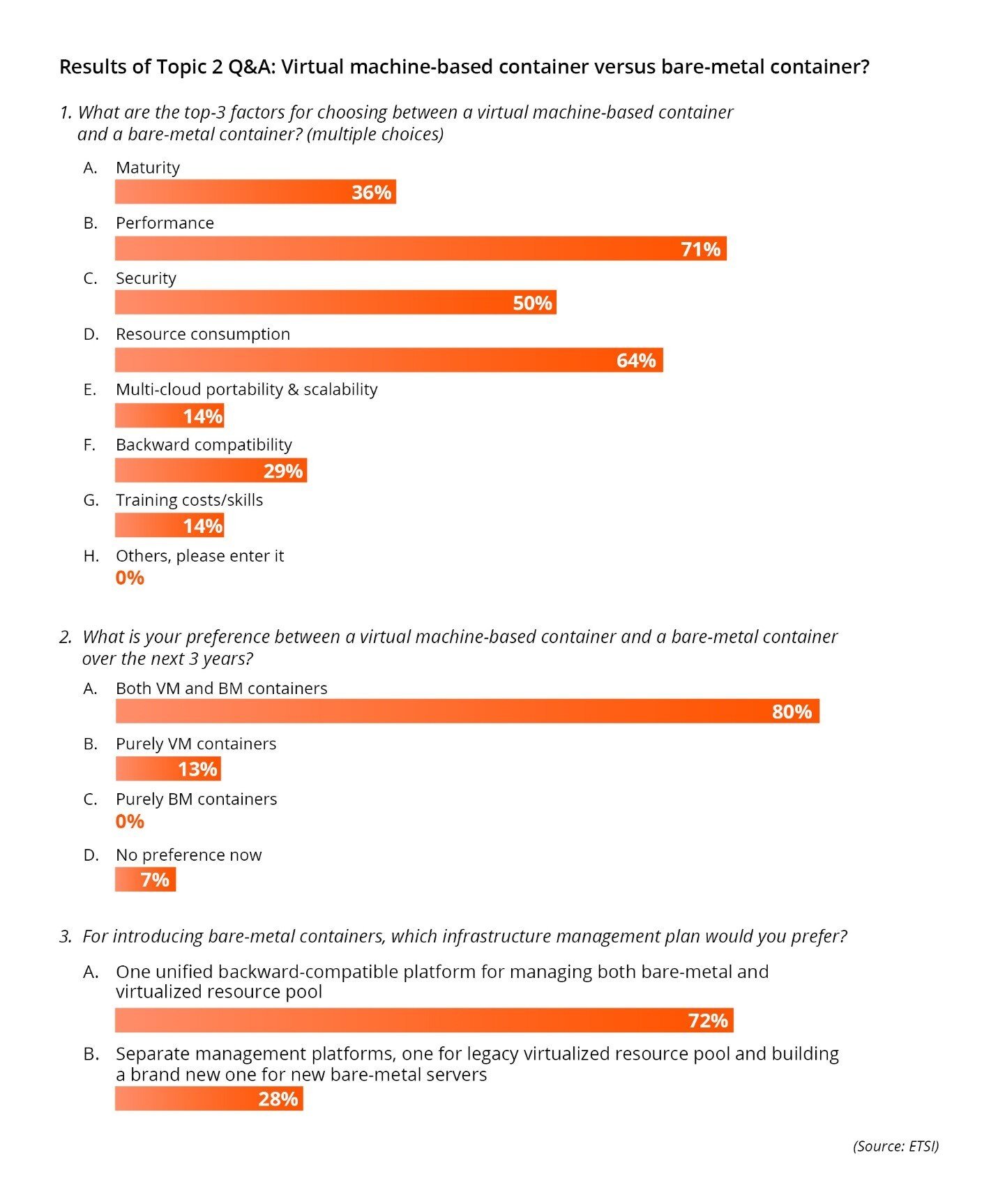 During the open discussion, there was debate as to how to promote telco cloud automation. Both operators and vendors recommended introducing methods like intent-driven Application Programming Interfaces (APIs). Moreover, from the perspective of a live network’s Operations and Maintenance (O&M) lifecycle, operators requested better observability to ensure network reliability. Considering the best approach to implement containerization, most attendees present suggested having a single unified backward compatible platform for managing both bare metal and a virtualized resource pool would be advantageous. Their top three concerns for choosing between VM-based containers and bare-metal containers are performance, resource consumption, and security.