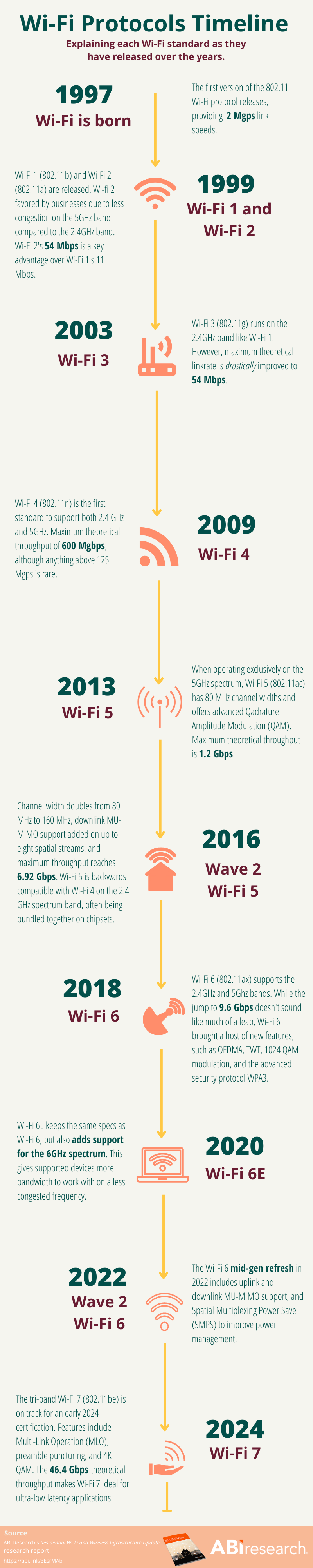 The following infographic describes the different Wi-Fi protocols as they have been released since 802.11 was first introduced back in 1997.