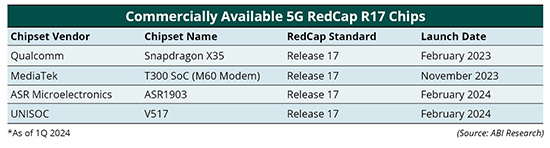 The first generation of 5G Reduced Capability (RedCap) chipsets have arrived, with Qualcomm, MediaTek, ASR Microelectronics, and UNISOC jostling to capture market share from sales to cellular module vendors, which, in turn, sell pre-packaged connectivity directly to device Original Equipment Manufacturers (OEMs). RedCap is expected to cater to a host of Internet of Things (IoT) applications, but the devices launched so far serve non-IoT applications—primarily Fixed Wireless Access (FWA) and Mobile Broadband (MBB). This ABI Insight discusses whether the commercially available 5G RedCap chips can make inroads in the IoT, and how chipset manufacturers can direct investments to ensure long-term returns.